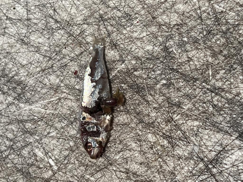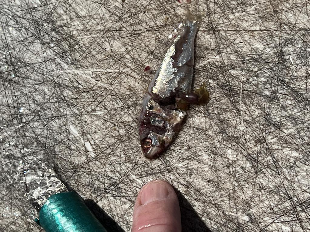 Had 1lb cocktails crashing bait for the entirety of the incoming tide from the minute we cleared the jetties. Keyed in on small baitfish ( see pic for ID, not sure if they are real small peanuts??) could not for the life of us get any to commit and they were literally bumping into the hull. Finally settled on 3/8 oz epoxy jigs in brown/silver and it was game on. Played around for hours keeping 3 for the dog.
