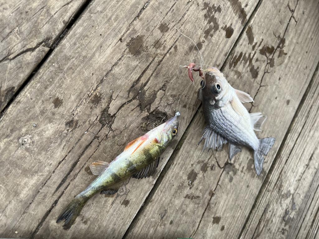 Went ultralight jigging in a 43 degrees Central Jersey lake this evening on a cloudy, cool day with a south wind small craft advisory. More than 20 fishermen caught a lot of fish. The Game Warden caught two of them fishing without a license. I caught and released 51 white perch, 3 yellow perch and a black crappie with Walmart red worm halves on two gold hooks and a 1/32 oz unpainted leadhead jig on 4 lb test line. Landed 3 doubles including a mixed double of yellow and white perch. Gave 10 white perch to Nadia at the Ukrainian National Home. Caught 697 fish in 23 trips this year for a 30+ fish per trip average. Saw an adult bald eagle catch a fish then eat it in a tree on the other side of the lake.
