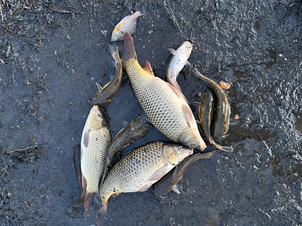 After catching 3 bluegills and a yellow perch on my last 2 ultralight jigging trips, I went to flooded, 60 degrees Robert G Martin Lake this afternoon. My spot was a tiny island surrounded by floodwaters. Fish 🐟 were jumping out of the water when I arrived. Threw out corn for chum, then had constant action on my new 3 hook rigs. Landed a bluegill, 3 common carp to 4 lbs and 7 brown bullheads to 12.5 lbs with 12 lb test line on my Mitchell #300 spinning reel and 4 lb test line on my Mitchell Avocet ultralight spinning rod. Didn’t get a hit while ultralight jigging. Lots of crows were flying.