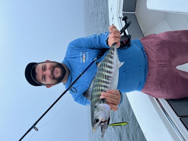 |  Fisher Price IV 9/8 Great Bonito Fishing Ran our open boat bonito trip today. Fishing was as good as it could possibly get. Held 3-5 fish on at a time for 3 1/2 hours. The guys managed to land over 125 bonito and a few blues. High hook was in the mid 30’s maybe more. Bait and jigs.
