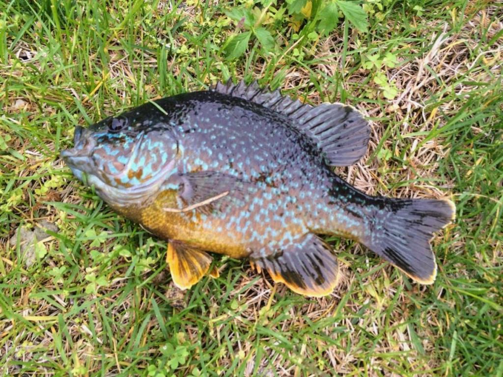 what do you guys think this is? a bluegill x green sunfish hybrid? |