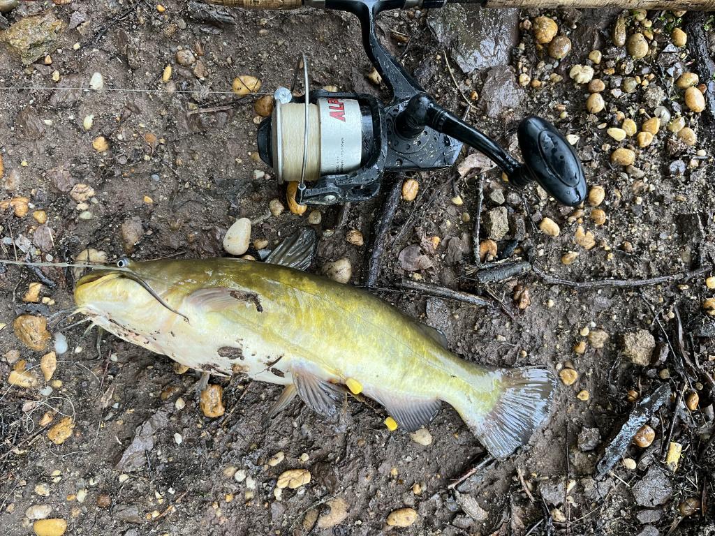 Went carping in 74 degrees, flooded Carnegie Lake this evening in the rain during a nor’easter. I fished in the rain 🌧️ 6 of the last 7 evenings. The water level of the lake dropped some but a hurricane 🌀 is on the way here. Water was less muddy but there was still a swift current in the lake at the Aqueduct. Only 3 people were fishing 🎣 when I arrived. No cars were in the parking lot when I left. Princeton University rowers were on the lake when I arrived, but they all left soon after I started fishing 🎣. Saw a young of the year northern water snake 🐍 swim across my spot soon after I arrived. Threw out corn 🌽 for chum, then caught and released a 14” 1 lb 7 oz 9.25” girth brown bullhead on my first cast of the day with canned, whole kernel corn 🌽 bait. I am applying for my 81th NJ Skillful Angler Recognition Award 🥇. Caught and released a largemouth bass with a 1/32 oz twister tail jig on 2 lb test line before losing the lure to a snag on the bottom of the lake. Also lost 3 hooks on a bottom snag.