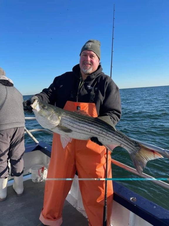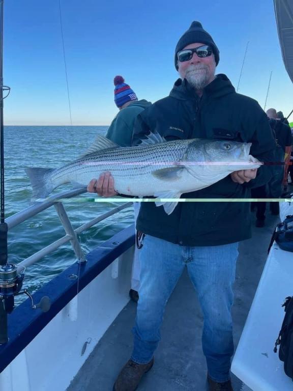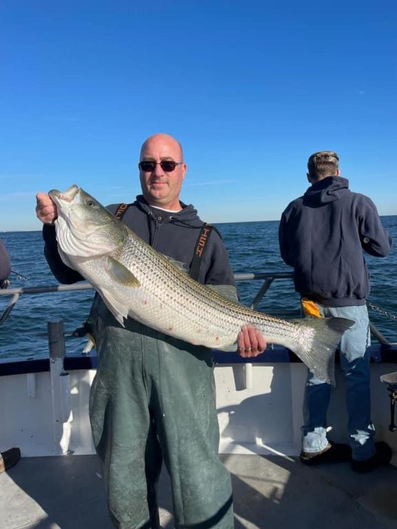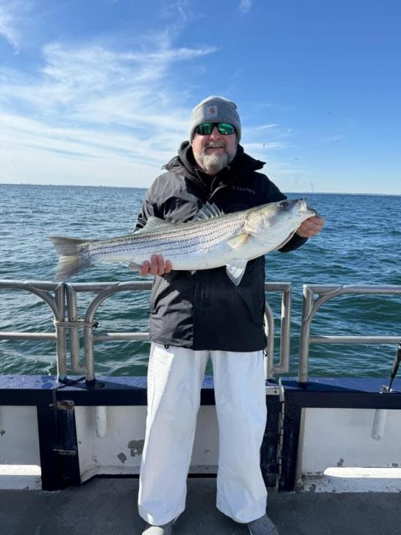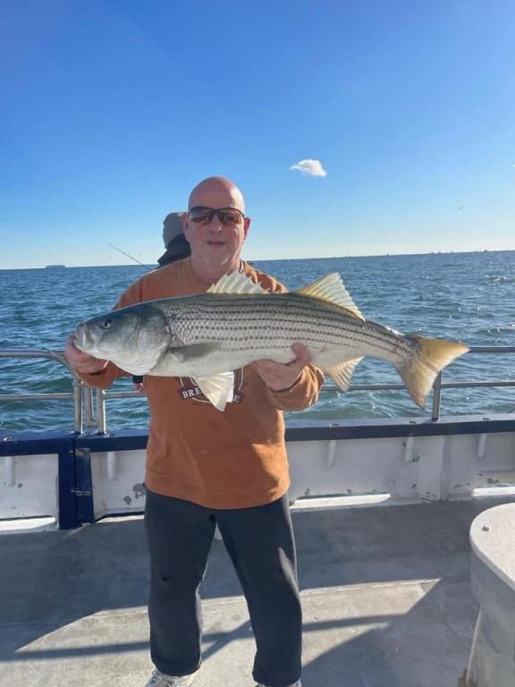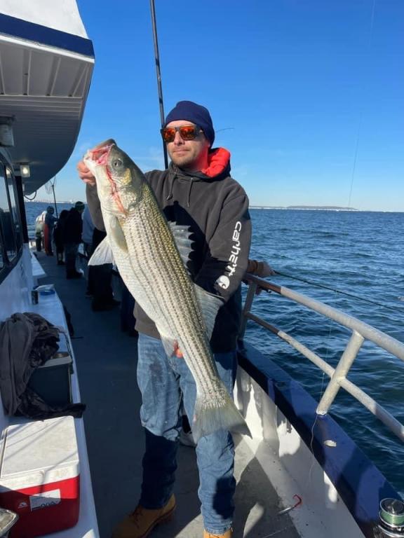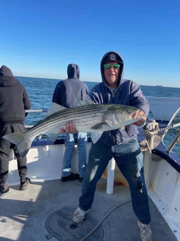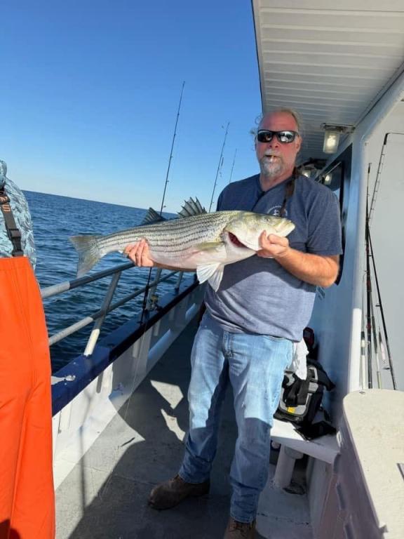 PROWLER5 FISHING REPORT SUN, OCT 27, 2024. Hey Gang,It was an excellent day on the striped bass grounds. Left the dock with a little breeze out of the NNW which quickly laid down and made for a nice flat calm day. We started fairly close to the fleet picking away on some rather large bass on jigs and shads. When the action slowed we took a little ride and settled in on a patch of fish until it was time to go home. The fishing was lights out with at least 3-6 anglers hooked up at a time for several hours. To top it off majority of the fish were personal bests for many onboard. Prowler regular Russel landed the pool fish with a scaled out 32.5 lb striped bass which was safely released.
