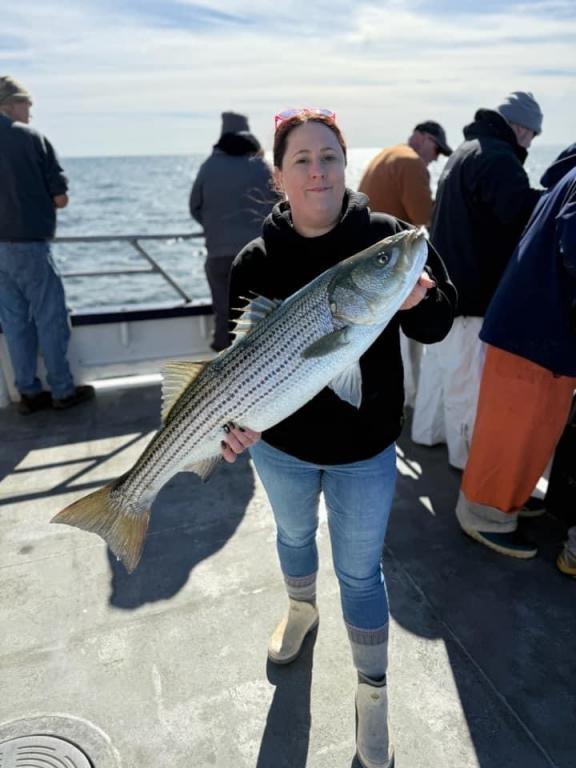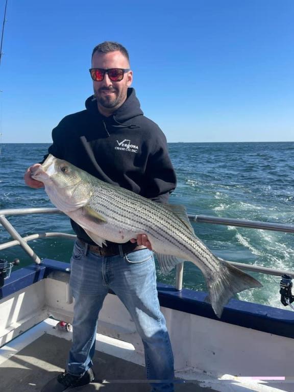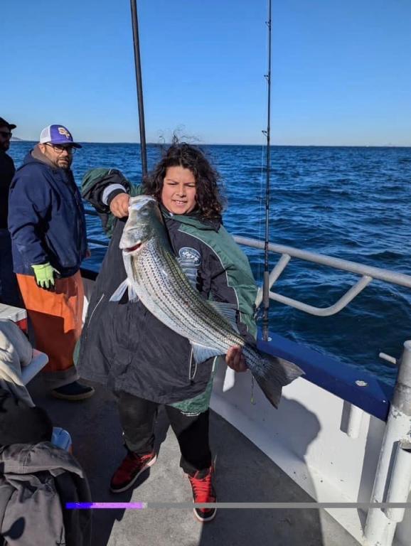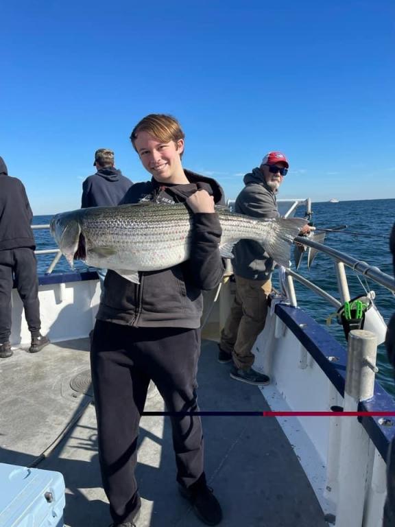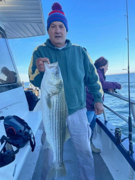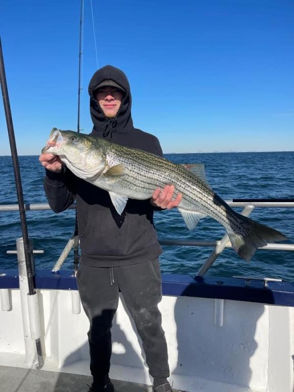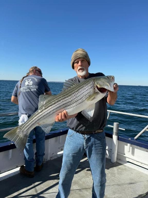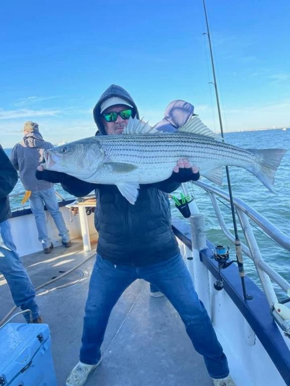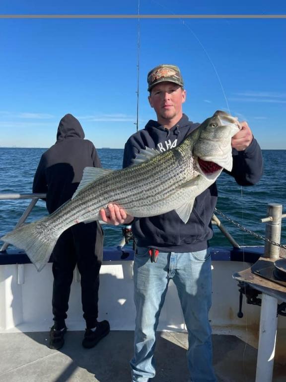 PROWLER5 FISHING REPORT SUN, OCT 27, 2024. Hey Gang,It was an excellent day on the striped bass grounds. Left the dock with a little breeze out of the NNW which quickly laid down and made for a nice flat calm day. We started fairly close to the fleet picking away on some rather large bass on jigs and shads. When the action slowed we took a little ride and settled in on a patch of fish until it was time to go home. The fishing was lights out with at least 3-6 anglers hooked up at a time for several hours. To top it off majority of the fish were personal bests for many onboard. Prowler regular Russel landed the pool fish with a scaled out 32.5 lb striped bass which was safely released.