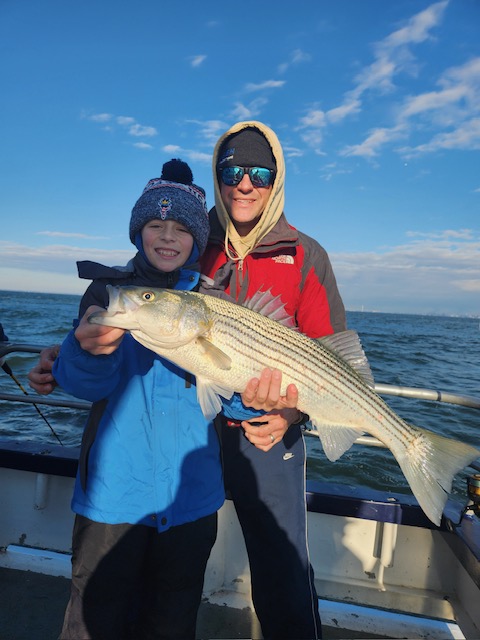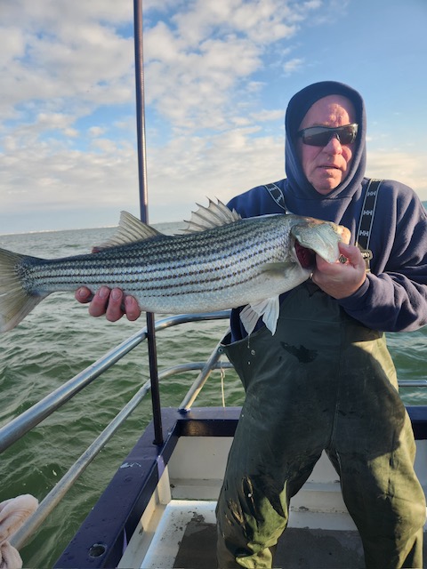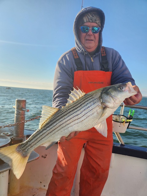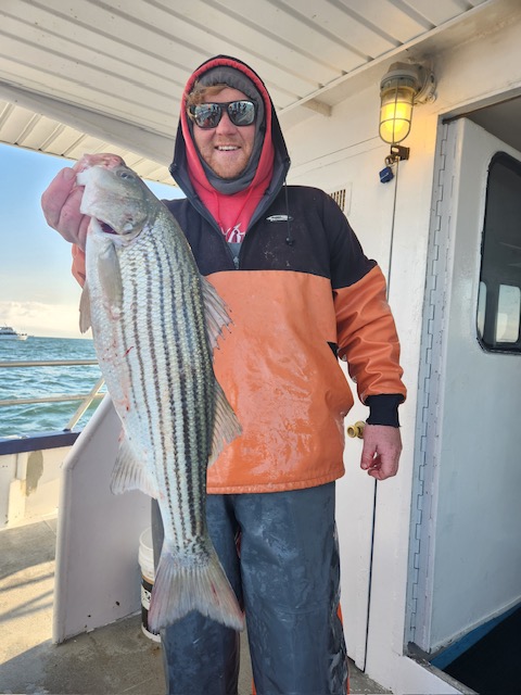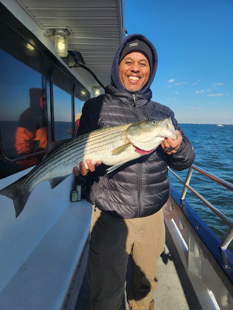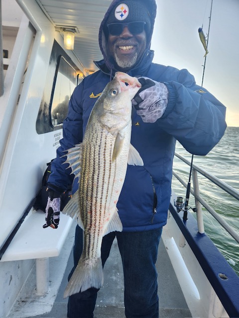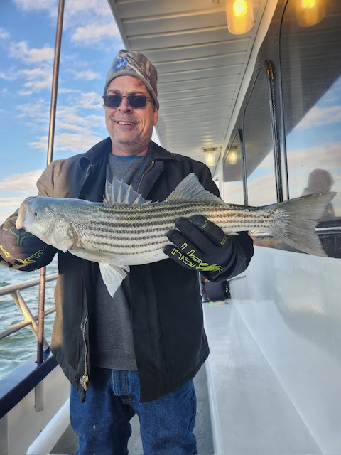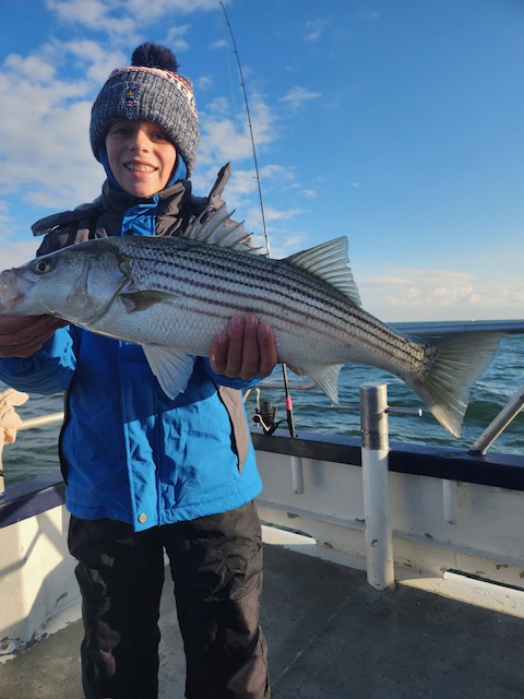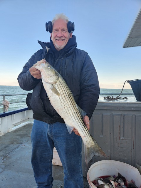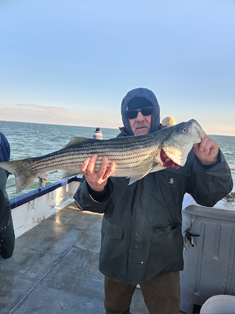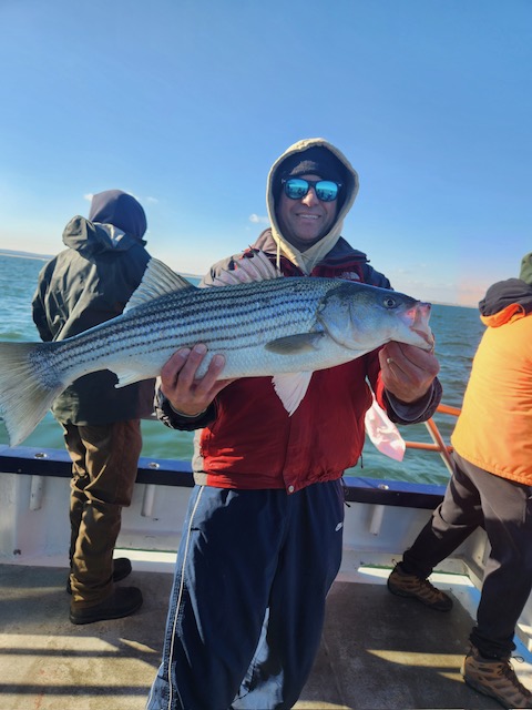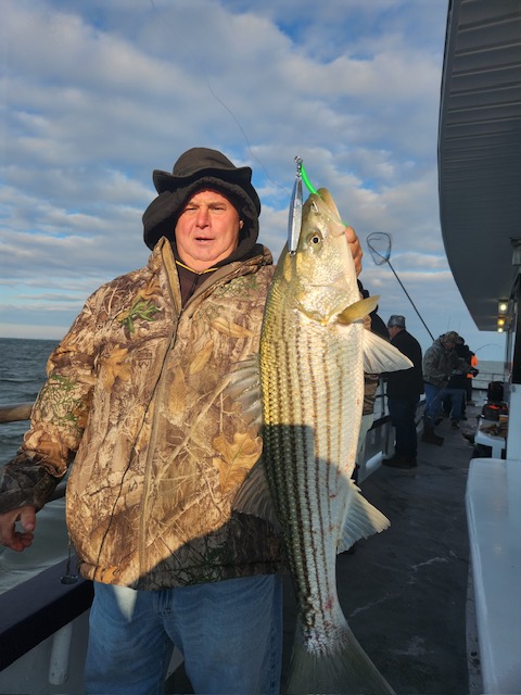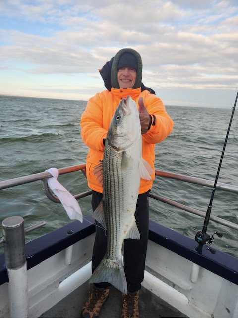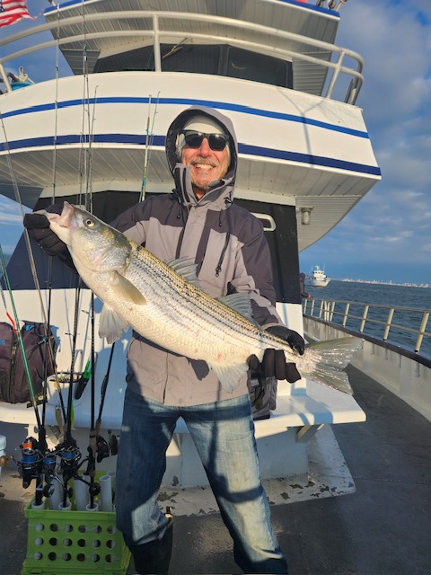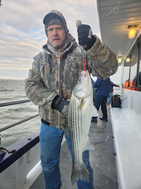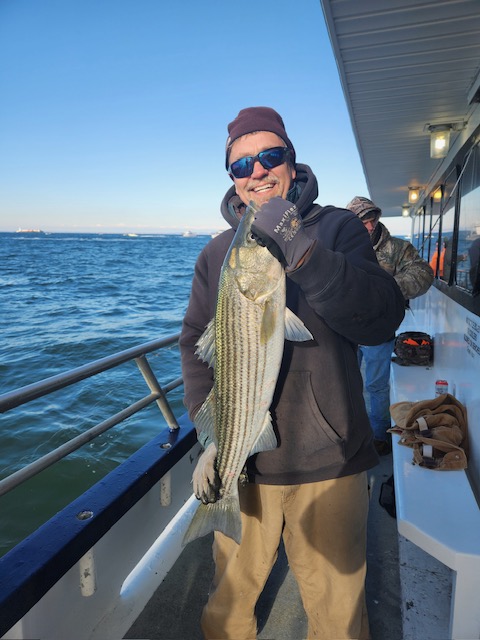Hey gang, we had a decent amount of Prowler regulars today and it did not take long to get the job done. We got it done in the first inning. Russell was back out again today and brought Derrick with him. They did an awesome job fishing the bow. Ben, Patrick, Jimmy, Ritchie and his brother Steve did great in the stern and the rest of the boat did great also. As soon as we got out to the grounds, me, Steven and Joey, Sr. had the nets flying. It was striped bass madness. We had fish all over the deck and 3 nets moving all the time. What a beautiful day out on the ocean for it almost being the month of Dec. Wow, I can't believe how the season is flying by. Just a beautiful day to be out with some great people on the boat today. All the action was on red tail and green tail jigs as they were spitting up tons of sand eels again. But, then again, Ben fishes with the shads all the time and he always catches them. Ben broke his streak yesterday of coming out every day. He told me he didn't think anyone would show up. Fishing every day (weather permitting) until Dec. 31st. The fare is $90; spinning rods are $10, if needed. Sailing 7:30 a.m. to 2:30 p.m. Joey, Sr. has plenty of jigs with tails and shads. It's going to be a beautiful weekend so don't miss the bite. Come down and join us. I'll be at the helm again tomorrow (Sat.) and Capt. Jack will be at the helm on Sunday. Thanks, Capt. Scott. Derrick won the pool today.