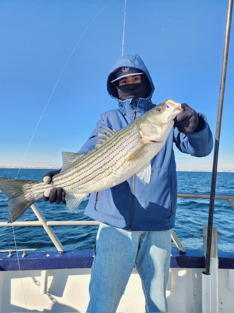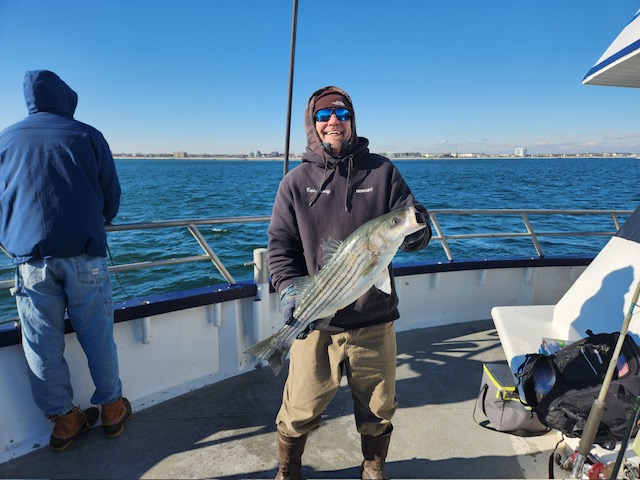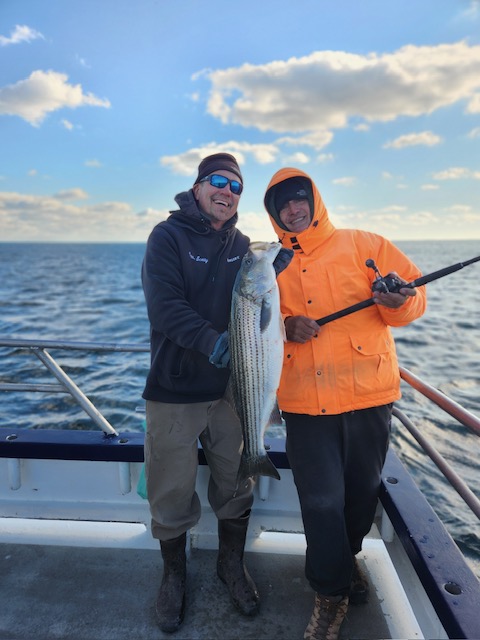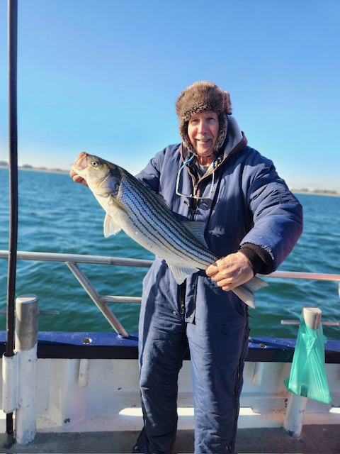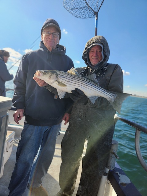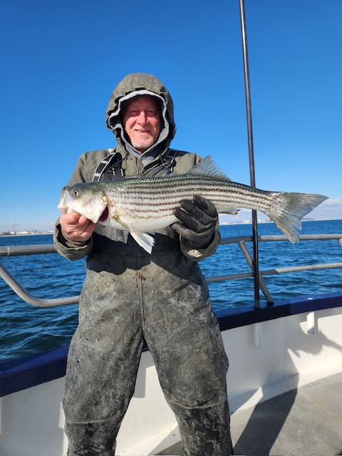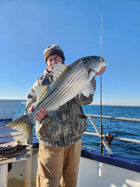 Hey gang, it was a beautiful, nice day out on the ocean. We steamed out to where we've been fishing the last 4 trips. I was surprised there were no fish or bait in the area. They must have moved. We had to look around and find a new area. We found some striped bass and everyone is going home with dinner again today. All the fish were caught on green and red tail jigs. Tomorrow (Wed.) is the day to come down because the forecast is for gale force winds on Thurs. and windy for Fri. It sucks, we won't be able to fish those two days. BUT, the weekend looks great as well as the beginning of next week. Let's go fishing. 7:30 a.m. to 2:30 p.m. Fare is $90; spinning rods, if needed, are $10. Thanks, Capt. Scott