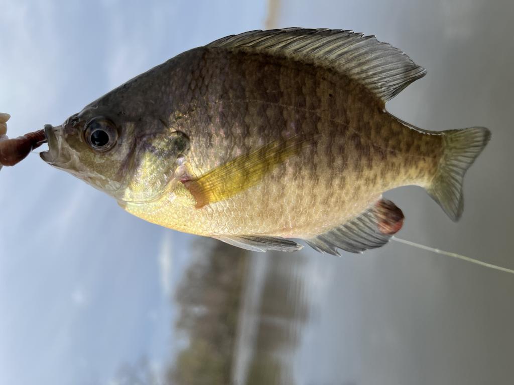 Went fishing 🎣 in 58 degrees Carnegie Lake this evening on a warm, cloudy day with a sou’wester small craft advisory. Air temperature was 74 degrees. 12 fishermen were at the lake. I caught and released 2 black crappies, a white perch, bluegill, channel catfish and 4 lb largemouth bass on my last cast of the day with 7-Eleven red worms 🪱. Took pictures.
