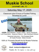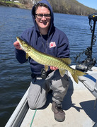 Hit the big river this week again. Temps were 45-49 Wednesday to Thursday. Got into a bunch of smallmouth on spinnerbaits, Neds and tubes. Lots of 12- 14 inchers with fat bellies with a few larger mixed in. Fish were pretty spread out all the river. I caught them in mid depth soft current as well as up in shallow faster water. Drifting down river and saw a mark right on a drop off from 5 feet down to 14. Tossed my jig up river and dragged it right off the drop and hooked up. Thought it was a heavy walleye at first then when I got it up saw it was a lower 30’s Muskie. Took some runs on my light pole and peeled some drag. She was hooked right in the corner of the mouth. Always nice to see the little ones. Looking forward to the warm up and come May I’m gonna start concentrating my efforts on Muskie again in a stretch of river I’ve never gave the effort in. Will report back. Also if you are interested in Muskie fishing we have 4 spots open in Muskies Inc NJ Muskie School taking place May 17th on Greenwood Lake. I’ll include poster below for anyone interested. Hope everyone is enjoying the beautiful weekend!