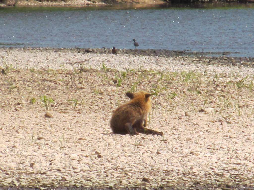 Andy from the coloration, that might be a baby fox. The black legs and ears make me think it might be. Maybe the mother was killed and the little fellow is on his or her own or the mother was somewhere nearby out of sight. I think the babies are more nocturnal this time of year, pretty much stay in the den during the day and only come out with mom at night so who knows. If something did happen to it's mother, it might be worth reporting it to F&G or a rehabilitator to see if it can be captured and saved. Or then again, maybe it is a dog as you suggested, other more knowledgeable people on the site might have a better perspective. Just a thought.