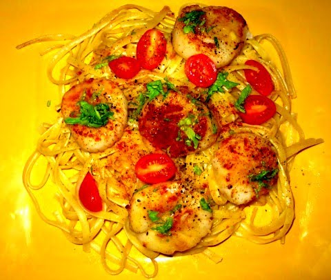 1 1/2 lbs fresh Scallops 4 tablespoons orange juice 2 tablespoons lime juice 1 chopped shallot 1 lb linguine sea salt, white pepper 2 tablepoons olive oil 1/2 stick softened butter Directions In a large 8 qt. pot cook the linguine, when done drain and coat with a little olive oil. Season scallops with salt and white pepper. In a 12in saute pan with olive oil, saute the scallops 1 minute on each side till golden In a small sauce pan add chopped shallots orange and lime juice, bring to a simmer. Add butter a pat at a time and wisk till disolved Reduce sauce until it thickens Serve scallops over pasta as shown. Add sauce on top of scallops Enjoy, Leif