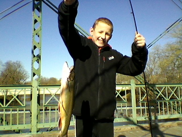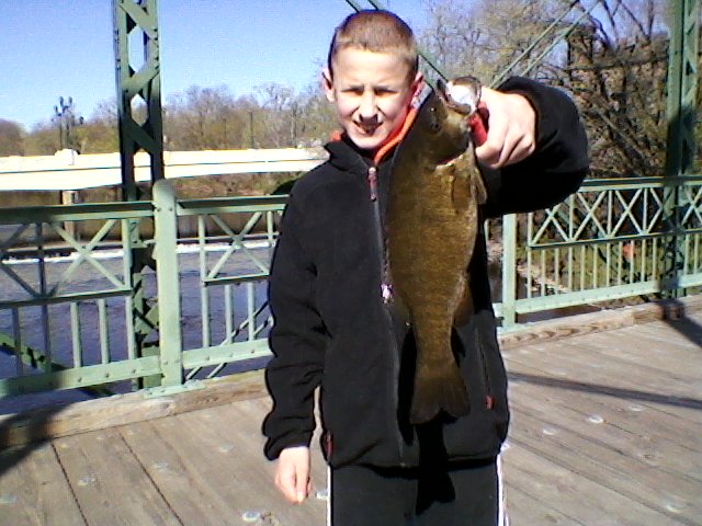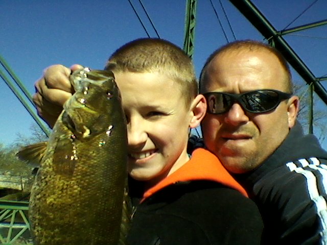 so sat morning, we were ready. we needed to go to dukes to meet some of the guys even though we did not hav waders to fish that area but i was glad to finally meet wilson and he told me andy hooked into a giant. good for him. we stole a ski pole and doughnut and took off for nevias bridge and as soon as we put a creek chub on... bam little O hooks into a nice brookie.. maybe 19 inches. i consider it a giant. then he hooks into giant bronzeback of i guess 20 inches way over 3lbs.. i was so proud, he was pumped up!! we regrouped and after mcdonalds , catch more chubs,ect and headed to my numb one honey hole and can ublieve it.. the little guy hooks into a giant bronzeback.. but no camera.. it was over 3 and a half pounds with giant belly.. he landed it, reel against drag and i went in water and wrangled it.. wow!! wow!! then he got another keeper nice smallie over 2 pounds.. i couldnt blieve the size of the belly on the smallies this time of yr.. thanks to the warm water
