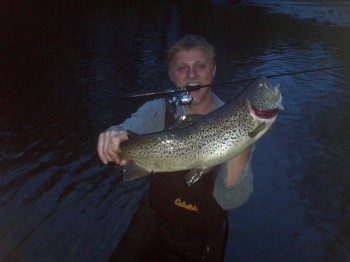After Sunday's battle with 60 plus trout and a beautiful 25in rainbow i was chomping at the bit all day at work to get back at it again. Left work late and had a few hours to kill to off i went the musky. I knew the rain would keep a lot of anglers away so my friend Dave and i took the 20 min hike up the conservation trail slipping and sliding in the mud but finally got there. I got to my spot and picked up right where i left off yesterday trout after trout. Many fish in the 14-17 in range with few 18+. The rainy day was going as planned and we were both wet but, giving Mr.Trout the business... After nailing the slob rainbow yesterday there was no way i would nail a fish like that again.... SO I THOUGHT!!! BAMM!!! I set the hook my reel screams and I'm off to the races down stream after this monster brownie! it was something from salmon river in Pulaski NY. The fish peeled an easy 50yards on the first run and proceeded to run seemingly for ever. Well finally i pull this beast to shore and i am in awe at this monster brownie! wow!!!! Dave took a spill in the river chasing me with the net my line was all curled up in knots from being stretched to the breaking point but, the fish hit the shore. Yesterday i threw the "beast" back. Today i kept him. i rarely keep trout but this one is a monster in any anglers book. i got home and measured him at 24inches and change @ 7lbs. Todays total for Dave and me in 2hrs of fishing 40trout 1 monster brown and one hell of a great story! pics will follow as soon as i figure it out