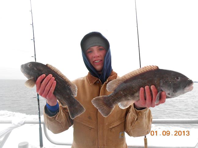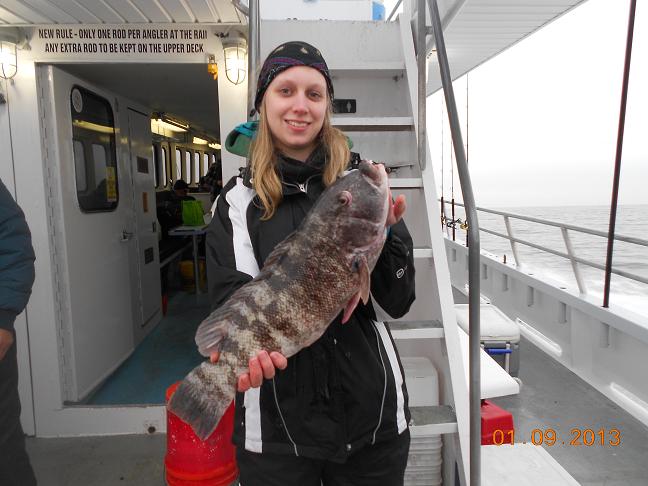 Hey gang, Capt. Scott here. I was down at the boat today when Capt. Glenn docked today. He stayed out an extra hour later to put more fish on the boat. Had some limits, but the fishing was a lot better yesterday. He said Andy took today's pool with a 7 lber. He said Kora Bielik of Randolph, NJ boated three nice keepers including a 5-1/2 lber on her 23rd birthday. Happy birthday Kora. We have guys coming down tomorrow, Thurs. I'll be running tomorrow. See you in the A.M. Heated handrails, green crabs supplied and white leggers available. I'll post photos later tonight. Thanks, Capt. Scott