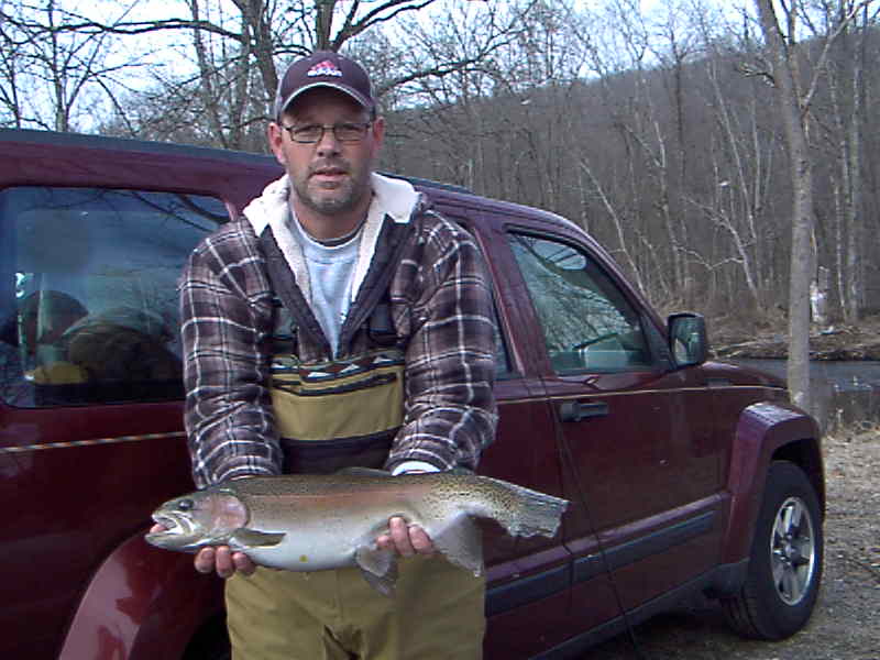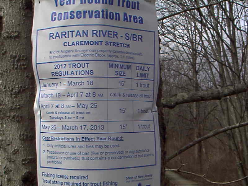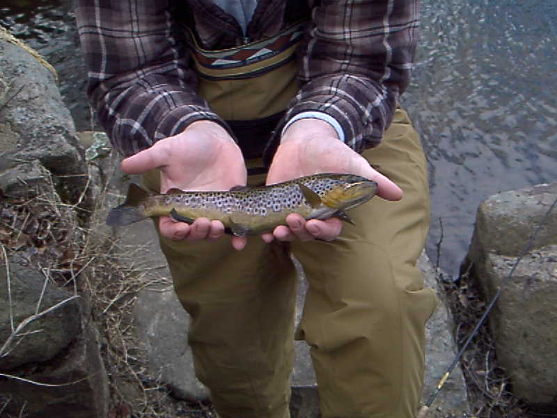 Met Shucker and Outofline and his buddy in Flanders and fished the upper South Branch off Bartley Rd. Walked alot on the Columbia trail and our group picked a few, Shucker lost a fat 16" bow along the way, went as far as we could till we hit KEEP OUT signs. Packed up and headed to the Claremont TCA. Before we got to the Claremont section Shucker pulls over at a spot along the road and nails a fat 22" rainbow. Claremont section looked good but our group only managed a small brownie in there. Don't remember the guys name that was with Outofline be he's a real trooper, completely deaf. Got my workout today, my legs are sore. Shucker and I peeled off at noon and Outofline was going back to the crime scene above Hoffmans Crossing Bridge. Snowed on and off most of the morning, saw only 2 other anglers today.