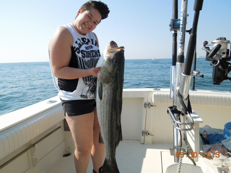 |  Bounty Hunter - Stripers With The Katie Staats Charter,  5/30 Capt. Paul had the Katie Staats charter on board the Bounty Hunter today. Katie and her crew have fished with us in the past but no one ever Livelined for Bass before. Again bait was easy to come by and once the Livewell was full Paul headed north. The first few stops on active bunker schools was not productive but at mid morning the Bass turned on. The big Blues were mixed in with the Bass and the rods were bent over pretty good. We landed 2 Bass and several Blues then we were stampeded. Lack of knowledge, courtesy and some pretty bad boat handling put a quick end to what was building up to be a good bite. We finished the day with 2 Bass and 3 Blues in the box.