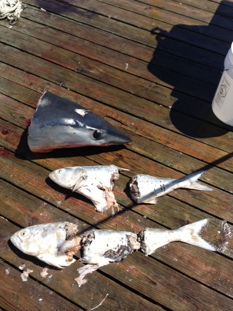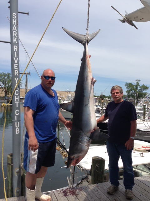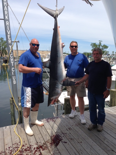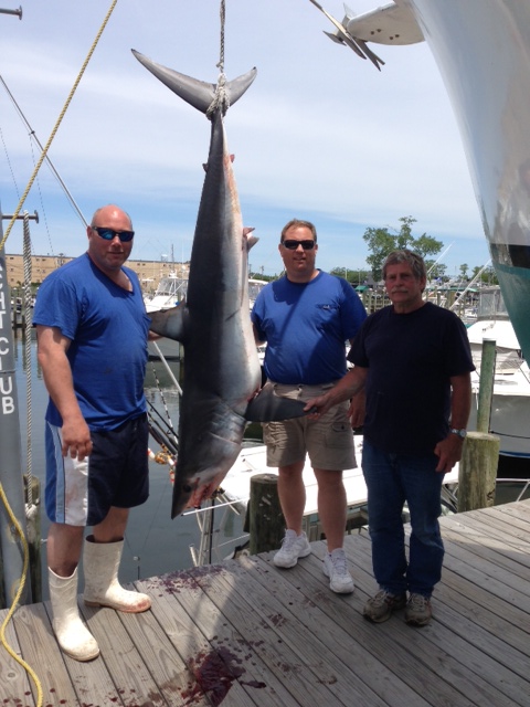 Could not wait to get offshore...our true love...and we picked a very good day. Fished with Darren and Joe for an offshore sharking trip today. Left SRI at 4:20 am and headed south with not many reports up this way in hoping of finding Mr. Mako. Got set up in 60.8 clean/green water and at 8:30 am had a pretty good hit. At first the fish did not go nuts...but after five minutes all of a sudden a 200 lb Mako jumps 20 feet in the air! Unreal sight. All of us get a clear view and we knew we had the right one on. Right after another huge leap... Tough Mako...around, down, left, right, backdown, forward, sideways you name it. One hour later we fly-gaffed a nice Mako. It weighed in at 234 lbs...86" long. It had two 10 lb bluefish in its stomach (see pic). Great day with an awesome crew!! This is the type of trip that keeps us coming back to the game...and it was nice that everything came together. Back at it asap... Joe T.