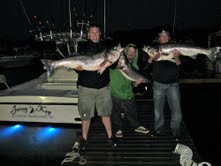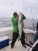Had Chris, Chris, and Chris aboard for a afternoon charter. Left the dock around 1PM. Set out and did 2 quick drifts for Fluke putting 2 keepers in the box and releasing a decent amount of 17" fish. Guys said they were ready for some BIG BASS! Made bite tight to the beach with one throw, filled the wells, and went looking around. Found some decent marks and decided to set up. Myself and my buddy Andy have been talking about putting a kite out for bass just to change things up a little. Thinking ahead I put the electric reel and a kite on board "just in case". With the steady wind it was a great afternoon to set it out. Kite went out, I bridle the first bunker and send him in on his way on the long clip. As I turn my back to get second rod rigged and I hear a huge splash. Turn around and see my bunker buzzing on the surface looking normal as nothing has happened. As I was about to get the other rod I happen to see the most vicious bass bite I have ever seen. Bass came half way out of the water and starts peeling line. Feed it...feed it...feed it...push the Avet Mxl to strike...pop the clip..reel in bow in line and come tight. Hand rod off to one of the Chris's and he fights the fish. Fish hits the deck and weighs in at 41# on the boga. This was Chris's first bass ever! Lines back out and no sooner baits in water we have a double. Land both fish a 28#er and a 43#er. I wish I had my go pro to get some footage of the insane bites. These buzzing baits were driving the bass nuts! Went and set up for another drift and put the lines back out. Soon after baits in the water 2 giant explosions again. Came tight on both, but unfortunately pulled the hook on both. Lines back out and again a giant explosion on the short clip. Bass was smacking around the bait for a solid minute with his tail, but never ate the bait. Guys were more then satisfied with fish in the box so we decided to leave and head back for the dock. I am going to make a few changes to our system and get it dialed in to decrease the chances of missing these fish. This was personally the most exciting way to catch a striped bass and was fun to try something different. It was incredible how aggravated these fish were with the "buzzing" bunkers. I will be running open boat afternoon trips all next week. Please contact me if interested.