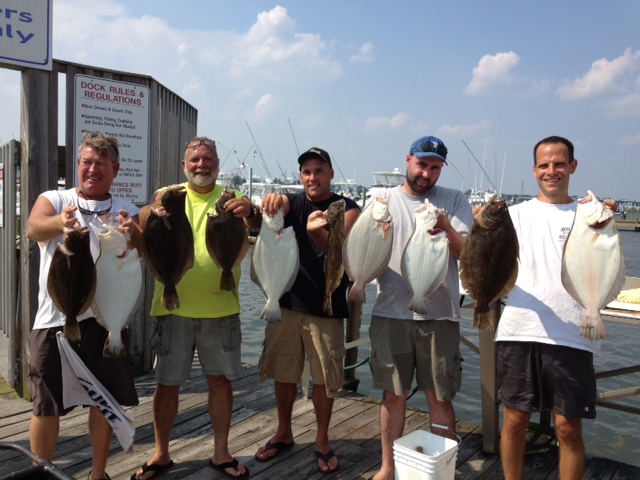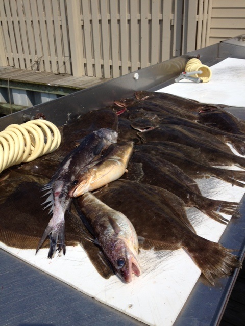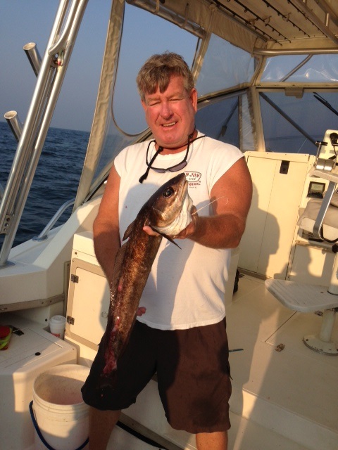 Bounced around the nasty stuff, lost some bucktails, caught some fluke, but it was a real grind. Once that initial area dried up, we bounced around, catching a couple here and there, but never got it going. AT lunch time we made another move, and by this time the S wind was CRANKING -- this time we found a nice pocket of fish and had a few productive drifts boating shorts and keepers, but by 2 the wind really got the drift going and we were flying at over 2 kts and 12 oz. was not holding, so we finished off in on the beach and caught a few more shorts but called it a day just after 3. Overall it was a tough day - the guys worked hard and boxed 16 keeper fluke to 4#. Ryan led the way with 4 keepers, and also had the biggest fish of the day. Great group of guys, just wish the fishing was better! (If anyone can positively ID the fish in the pic below, which I think was a cusk, please reply here!) |