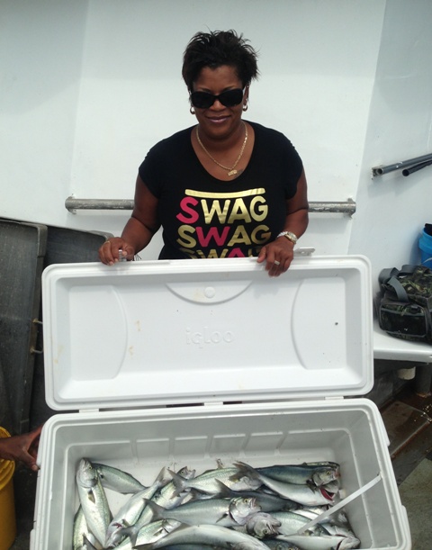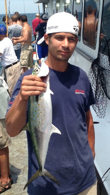 Bluefishing was good again today. We were catching smaller blues on jigs. The best area was 10 miles East of Brielle. We saw plenty of fish in the area and they were on the surface feeding, at times. We even caught a Spanish Mackerel today. Last year when the blues moved into this area they stayed for weeks, and we were able to catch them every day. When the larger blues move back in range we will fish for them. Until then we should have good action with the smaller blues. Night bluefishing was terrible over the weekend. The body of bluefish that was South East of the inlet pushed offshore, and was out of range. They should move back in soon, as the full moon passes and we have a change in the weather with northerly winds forecast this week. The pool winner was: Tom Panyko from N Brunswick NJ with a 4Lb Spanish Mackerel. The big Jamaica is scheduled to sail every day at 7:30AM and every night at 7:30PM