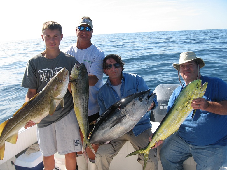 Had regulars Larry and Murry, with newcomers Ron and his son Ranger. Started out finding the life I wanted right away and released our first Tuna in the first 5 minutes, had a slow pick on the troll for the rest of the morning. Did have some nice fish going 3-4 on fish to 50lbs. Tried chunking and jigging and had nice Mahi to 10lbs. Wound up the day hitting some wrecks and had half a dozen baseball bat ling and Cod to 20lbs.