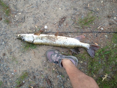 Hit a new spot today for about an hour paid off pick up 2 nice size pike. problem was has trying to lift the fish four feet up from the water. lost one that broke my the but got the bigger one up. Not bad of a fish on a ultra light rod with 4lb test. FYI my shoe size is a 12 for reference