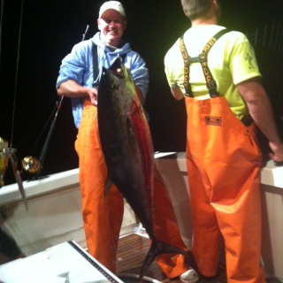 Drop back down to 70' where there was some nice marks and my jig gets slammed and my rod doubles over and then goes slack and I started cranking as fast as I can and up comes a 200-300lb swordfish that takes me to the other side and then under the boat and around the prop. Now I am doomed! I feel him thrashing and then nothing. Reeled up and his sword tore apart my leader. Next was a small longfin on my jig and then things slowed down. Good thing, we could not fit any more tuna in our coolers. Split at first light with 13 yellowfin between 70-100lbs. another one at 40lbs. and one longfin at about 40lbs. Great trip with great weather. We could have caught more but we were only fishing a few rods once are coolers were almost full. Attached is a picture of the 75lb. yellowfin.
