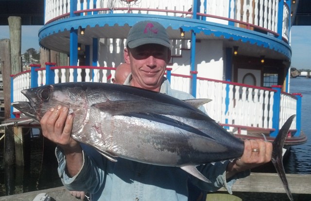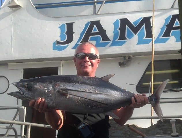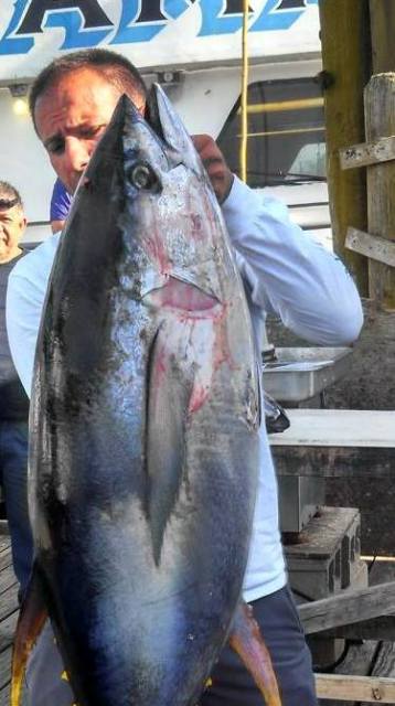 The weather for the Tuesday/Wednesday Canyon trip was a little choppier than predicted but it did not stop the Mahi-Mahi from biting. We spent most of the day fishing for mahi and landed over 200 fish. As the sun was setting we anchored for the night to fish for tuna and swordfish. Our first bites came around midnight when yellowfin passed through. Nuno DeCosta landed the first yellowfin. Another was landed and a couple lost at that time. It was about an hour later when they passed through and we landed two more. After that Dan Hospodar hooked a 180LB Mako. After a tough battle and a couple of leaps, the Mako was landed. It was quiet the rest of the night so we went on the drift just after sunrise. There were loads of porpoise and a good number of humpback whale feeding in the area with tuna underneath. We made a few more drifts and landed one each drift and lost several more. The big Jamaica is scheduled to sail the Canyon every Tuesday and Thursday at 7AM for 31hr trips and Friday, Saturday, and Sunday night for 22 hour trips leaving 5PM. There is also space available on other upcoming trips. For information go to www.bigjamaica.com or call 732-528-5014 Our Giant sea Bass schedule is now available. In November the Jamaica will sail for Striped Bass and Blues. Bluefishing this weekend on the 110’ Jamaica Star sailing Friday & Saturday night at 7:30PM and Saturday & Sunday at 7:30AM. More Photos at our Facebook page
