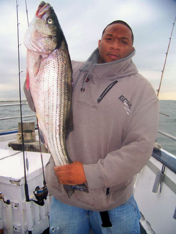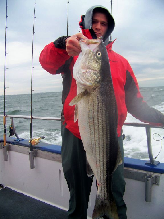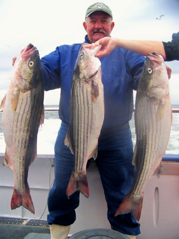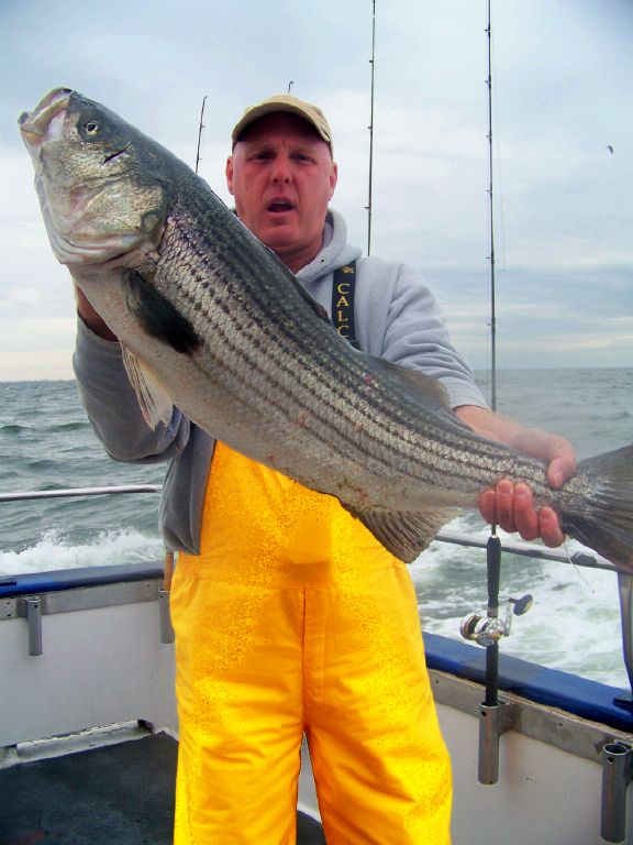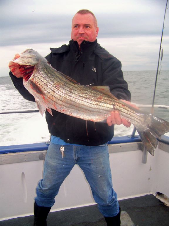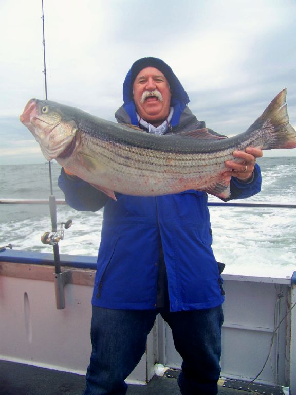 Loads of Sand eels and herring around and we stayed close to home for a change. Not many customers down as we were the only boat out with a handful of guys. Bite lasted till the end of the tide then it just got too ugly to fish with the outgoing. Capt. Howard lead the way with 4 nice fish followed by Tim who had 2 beauties and some singles for the rest of the customers. Pool fish went 24 pounds. Trying to get the dam video to work but like last year it probably will take two days to figure it out!!! Back at it tomorrow as the weather is looking perfect for Striped Bass fishing. We are Chartered this coming Sunday morning. Capt.Ron |