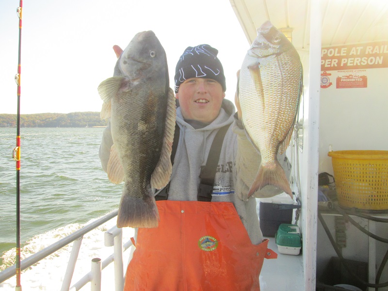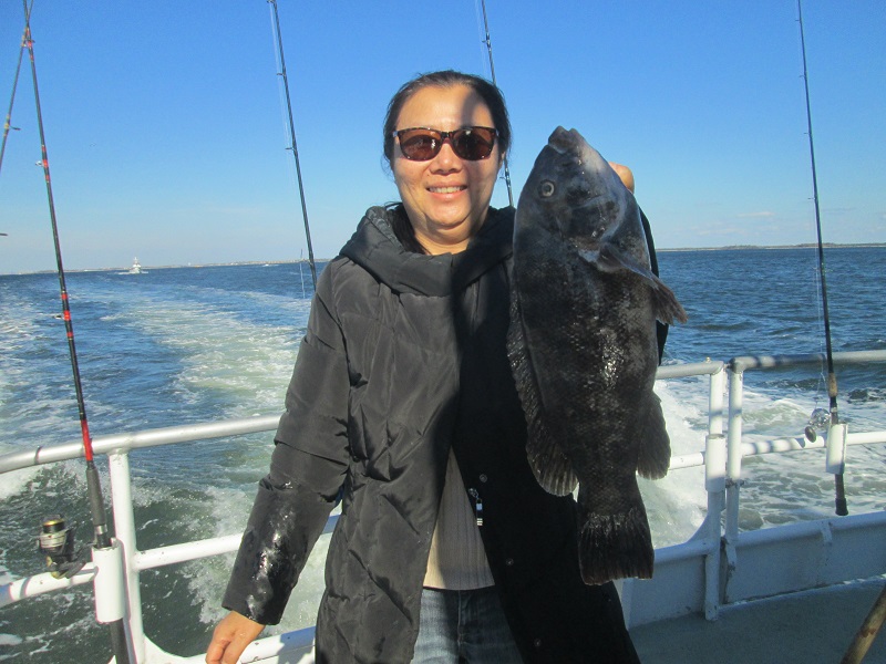 Today started off with some nice tog and ended with some very nice porgies. Yes the wind did blow but we were in close to the beach and it was a nice day. Grace Onaga from NYC took the pool with a nice tog. Check out the porgy LJ is holding, as big as a tog. Wind dieing tonight and west on Sunday should make for a perfect day.