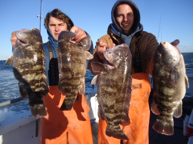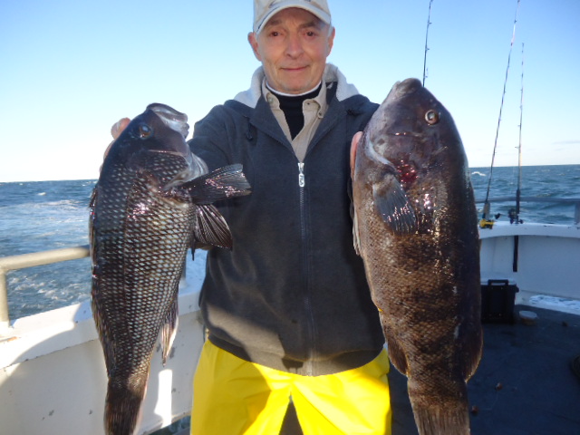 11-19-13 Very windy,,and cold today.Perfect blackfish weather..The fish were chewing today as soon as we came tight on the anchors....We caught both size fish today,,some nice quality fish in the 6-7 lb.range and quite a few throwbacks as well..Everything inbetween...Even some of the rental rods today caught a few keepers....along with some who caught there limit...Today they chewed everything ,,,,,,greens,whites,even the tiger crabs...Check out some pics..See ya tomorrow.