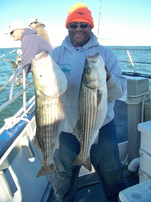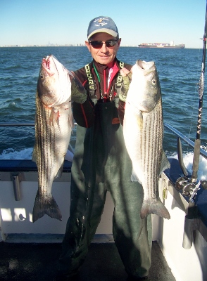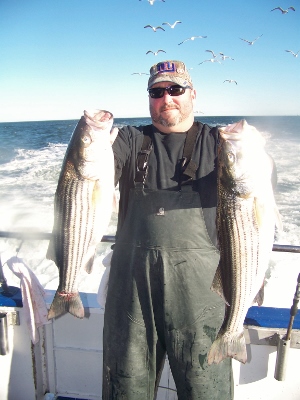 Had my choice of spots to fish all day, from one channel to the other. Birds working all over, some on bait, some on fish. Bass and Blues, limit catches and many throw backs for the day. Couple newbies to Bass fishing had their limits and then some. Current and wind together after the change, had us drifting 3 knots at times so it was tough to stay in the bite. Had to make a hundred moves through-out the day to keep up with the life, but we got it done. Never have I seen so much bait in all the years on the water, Sand eels, Rain fish and who knows what else is down there this time of year. NW and outgoing tide tomorrow, should be good for fishing.... Capt. Ron |