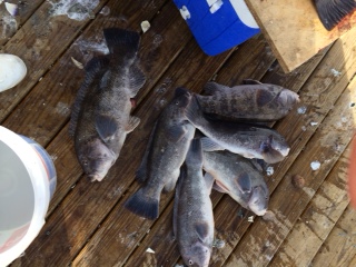 The tog bite on opening day (Sat) was not as fast and furious as Friday's mayhem, but we still put together a respectable catch. Henry was the first to reach his limit at 8am (all on jigs) and a few of the others followed shortly thereafter. Around 10am, the wind shifted to the SE and the bite turned off a little bit, but the gang still picked away at them for the rest of the day. We finished just shy of a boat limit with 30 keepers for the 6 man crew.