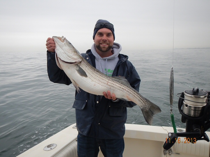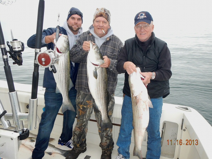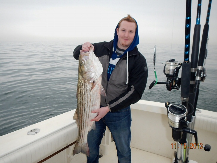 The great Striped Bass fishing continued today on the Bounty Hunter for the Bill Zuchero charter. Along with Bill were fishing buddies Walt, Chris, Ron, Matt & Jon. Paul made his way back to yesterday's spot but found vey little in the way of bait or Striper activity. A move of a few miles put us right in the middle of the feeding Bass. We Trolled a few and Jigged a few and by 11AM we had a Limit catch of 12 nice Bass in the box along with 6 Bonus fish. The split today was about 50/50 between Trolling and Jigging. The Bass bit just about everything we put in the water. Over a dozen short Bass were released but we did keep 4 big Blues. It was another good day of fishing with a group of longtime Bounty Hunter supporters. They will return next week and hope to pick up where the ended today.