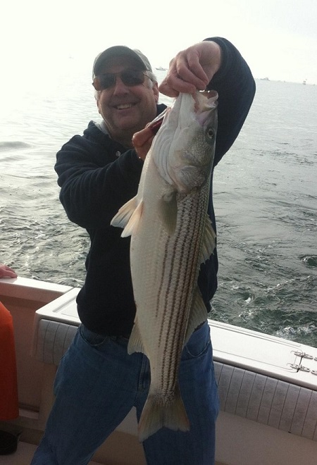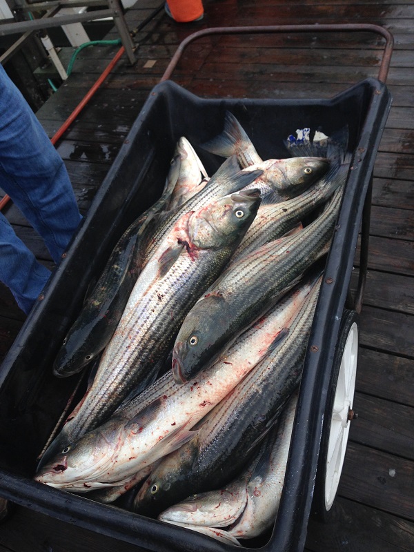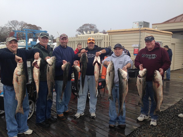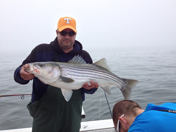 Got out early, found the fish, threw jigs at them as they were swirling and blasting sandeels and rainfish up top - only got 1 short. Ran to where we caught some yesterday, heard the bite was on, put the rigs in, and it was game on. Singles, doubles, triples, all bass for the next 3 hours. Great bite with mixed size fish from shorts up to our biggest which was 15#. We were boxed up with a limit by 10, and continued to pick until the fog rolled in. The bite shut off by 11 and we slow trolled home through the pea soup fog. Wound up keeping a full boat limit of 16, had a load of shorts, plus a few right at 28", and quite a few 27.5"ers to keep it interesting. All but one fish today came on the troll. Great day with a great crew! Back in time to watch football on a Sunday - can't beat it! |