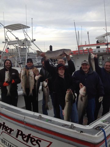 Today we had bob n friends out for some striped bass fishing. We headed up to the same area as yesterday morning to some great conditions. It seemed we were going to get better fish,since we started w a triple header with 2 being keepers . Trolled for hours w non stop action of shorts n a few keepers. Made a move closer to home and we had a nice pick of all keepers. Adding another double header keeper. All in all it was a great day on the ocean . Thanks again guys . See u soon