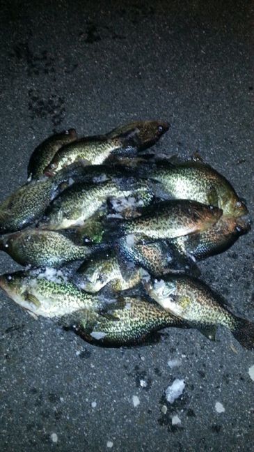 Had a craving for one of the few fish I like to eat yesterday the crappie, so I headed out to my go to crappie pond. Man I don't know if anyone got out yesterday but the fish were feeding heavy! Started out with a few slob perch and a 3 1/2 pound largie, what an awsome fight on 4 lb. Test and and ice rod! Wound up with about 8 largemouth, about 6 jumbo perch, a few sunnies, and about 40 crappie fishing from 12:30 pm till 5:30. Once we hit the crappie it was game on!!!!! Kept about 15 between me and pops for delicious ice water crappie fillets. This is a mountain pond so the water is crystal clear spring fed which is a must for me to eat fish. Oh and its a 25 min walk to get to the spot which keeps it under pressured. Did anybody else get out yesterday man it seemed like the fish were extremely active.