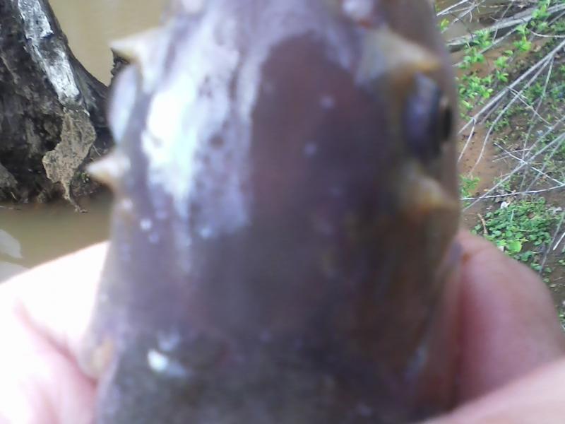 Wondering if I could get some help to ID a fish I've never seen before. I caught 2 of these in the Manasquan river on a worm. It was about 10 inches long, mostly silver in color and darker towards the top. It had a similar shap to a sucker, only it had a forward facing mouth and a thicker head. The odd thing was the 4 yellow spikes it had on its head. The pic is a close up of it's head. I've fished this river for over 30 years and have never seen one of these.