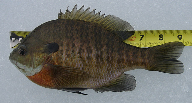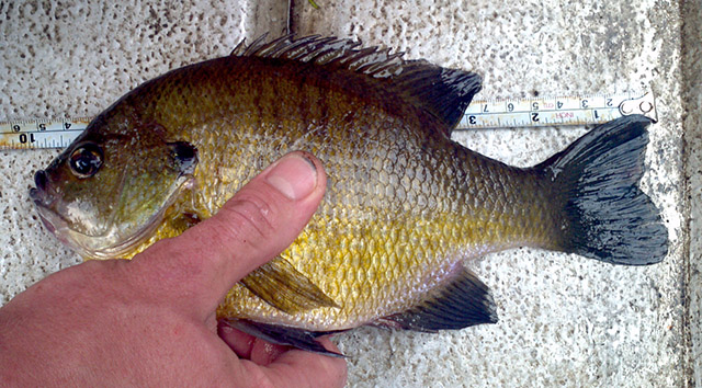 that is a really nice bluegill. very 'showy'... to me it looks a lot different from most of the other bluegills up in the northern parts of the state... very large gill flap and long fins by comparison. more like the 'gills that they catch down south. i wonder why the difference. very nice fish.