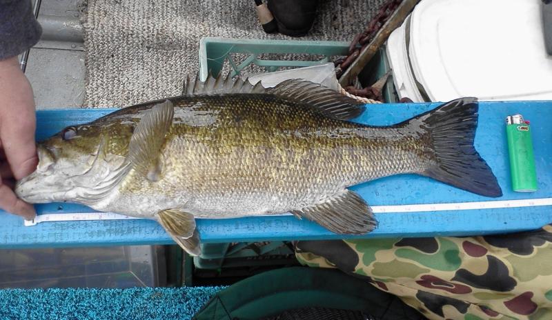Met up with Dale (GetANet) this morning for a trip up and over to a big, deep body o' water. It was pea soup heading up. Visibility was crap... But we kept on truckin'. Launched around 7:45 AM after scooping some herring on the way. Shot across the watershed to a shore I've never really fished before but recently heard of/saw some quality activity being reported. We were not disappointed. 1st up was Dale. Live lined herring gets punished on the surface. Nice hook set and a good fight--yes? Let's call it, adventurous! Dale had a minor reel issue that was inhibiting his ability to gain on the fish so what does he do? Revert to tip up style and handlines the goddamn thing lol. He made solid work of the fish and a few mins later I scoop up an 18" SMB boatside. Niiiiice... Measured (lighter and tape, of course!), and released. Good start. A short time after that, I switch to a live lined herring on my ultra light setup and get popped... Again, crushed on the surface. This time its a 22"-23" pickerel--my first in this particular body of water, and she was chuuuuuuubbbbyyy lol. Well-fed fish were the day's pick! Pic coming...