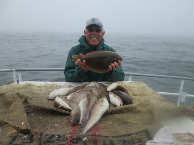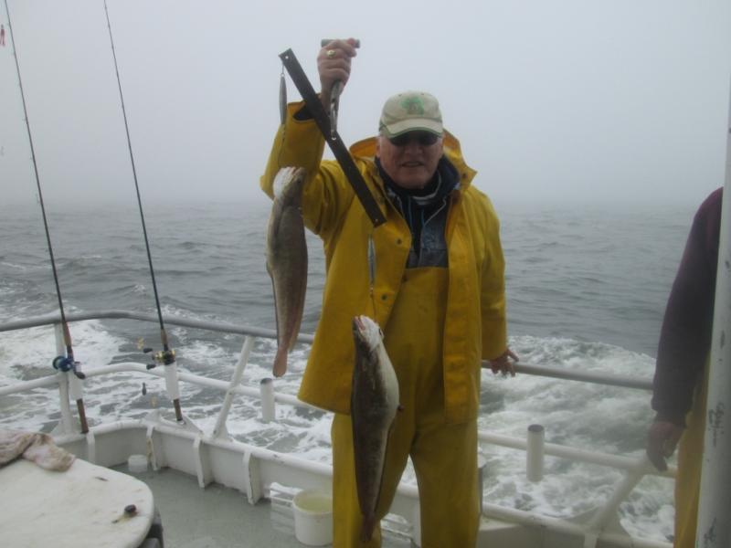 Not many people for a nice day other than the fog and the ling were hungry. There was one problem thou, the anchoring conditions were as bad as they get with a south wind and outgoing tide. Keeping the boat on the wreck was next to impossible and we ended up drifting. Tom the Baker was high hook with 25 to 30 ling. He is shown holding a pair of nice sow bellies. He lost the pool to Steve Brandon from Parlin holding the pool scale. Condo Bob Had one of our first flounder to add to his ling catch.