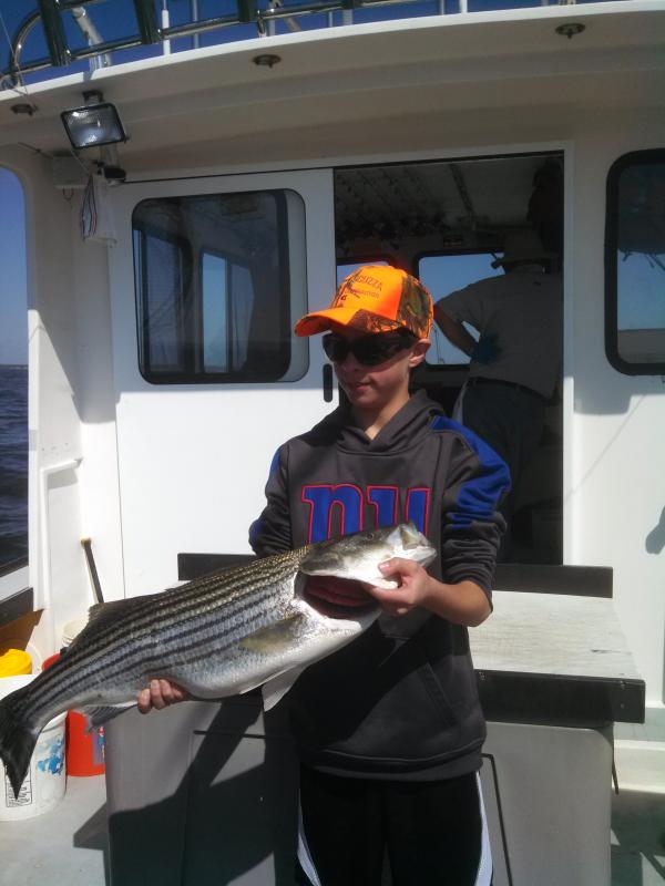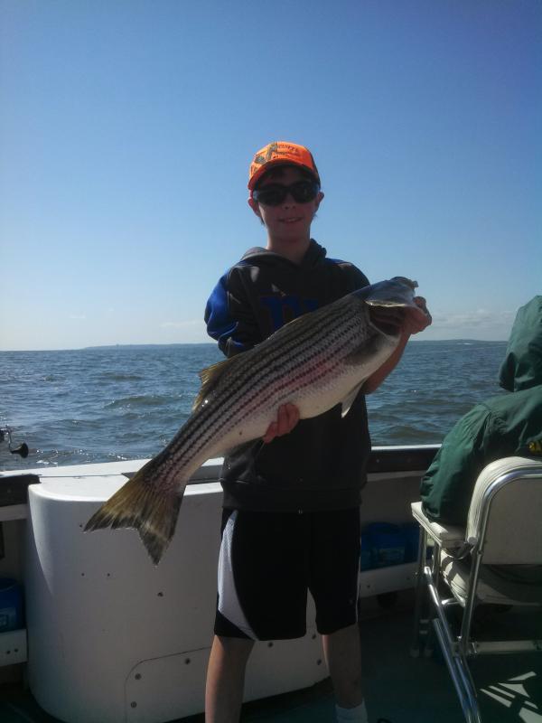 Struggled to put a catch together today but Antonio and his crew got an A for effort. We headed out to Romer this morning and were greeted with a little rougher conditions than expected. Despite catching 2 keepers and loosing another almost immediately we pulled the hook and headed to calmer water. The troll to the back afforded us one monster blue and despite the piles and piles of fish on the radar we couldn't get em to bite. Good food along with great laughs and stories made up for the lack of striper cooperation. We will be back at it in the am to try again. Attached is a picture of Alex with his nice bass.