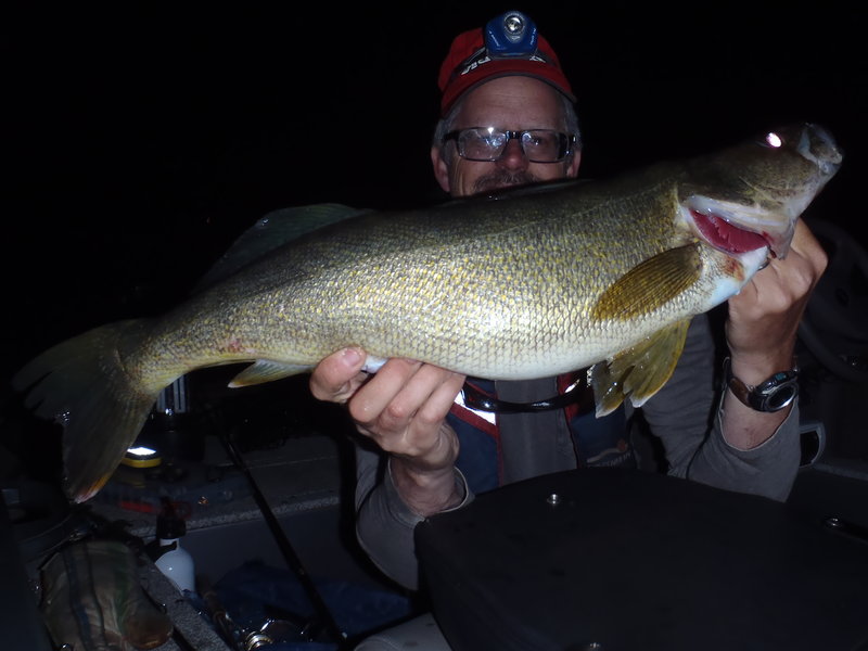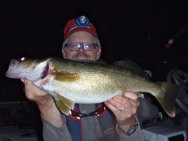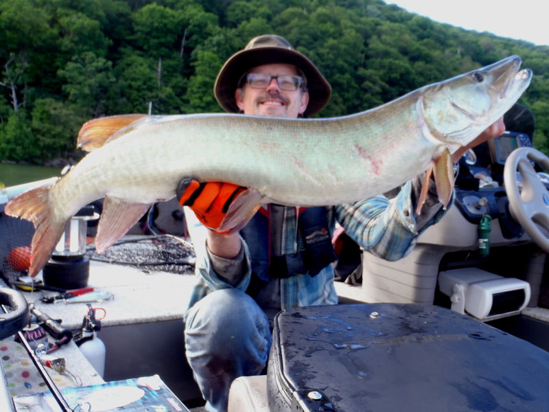 Man was it cold and windy last night/early this morning....2 walleyes up to 8 lbs. These NJ fish have some condition factor.....small heads and massive bodies. 2 others hooked but no love... and one explosion and miss as the boat. Also managed a scrappy smallie and a rock bass. Morning comes and I am making a left of off the top of an underwater hump with a Leo's Lures crankbait and the rod goes off. Monster B'day Musky.....enjoy! Capt. Dave