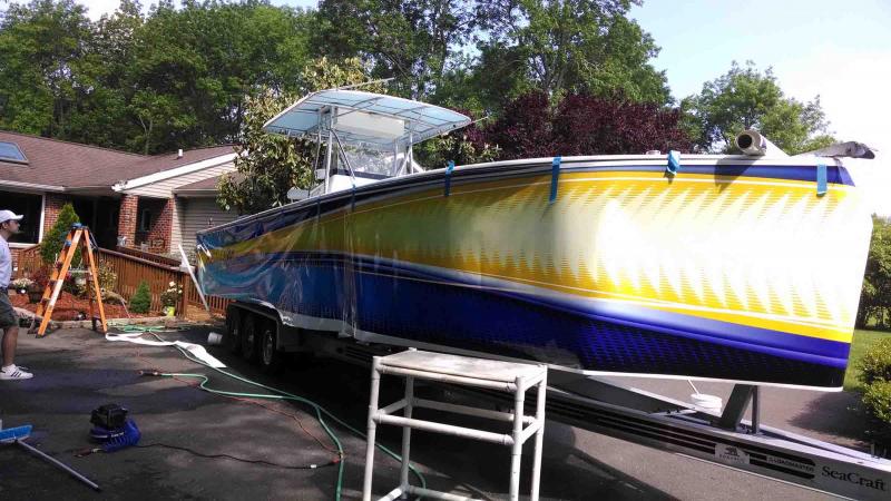 I printed the wrap on Thursday night....installed it thanks to my buddy Walter on friday and was in the water on Saturday! Looks so much better than the dull blue gelcoat that exists underneath it.