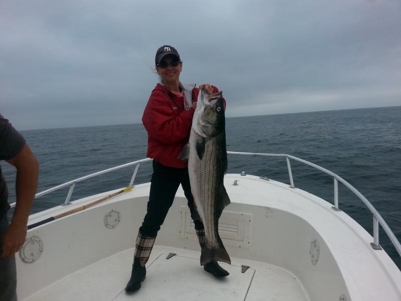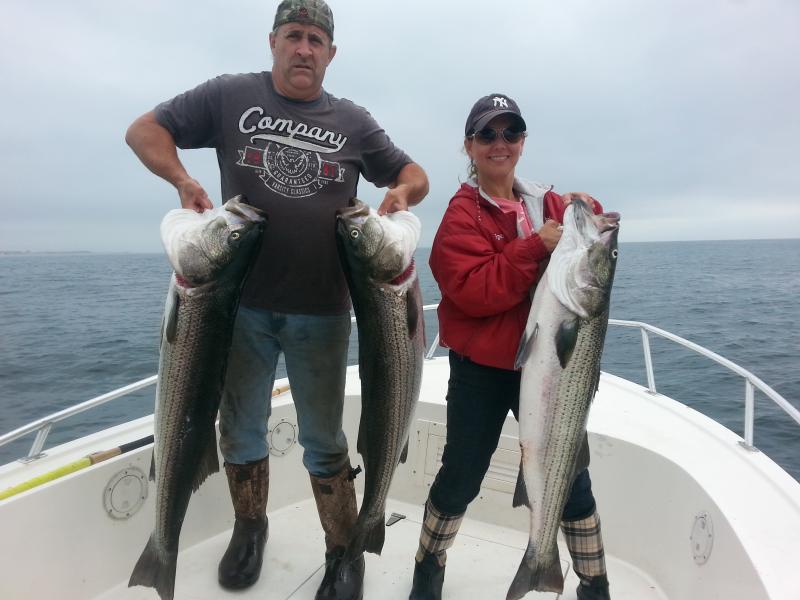Had Bob Fox and his girlfriend Jen. It was a very short, quick bite but were able to boat 3 nice bass. It was both their first time to catch a Striper. Congratulations, Bob & Jen.