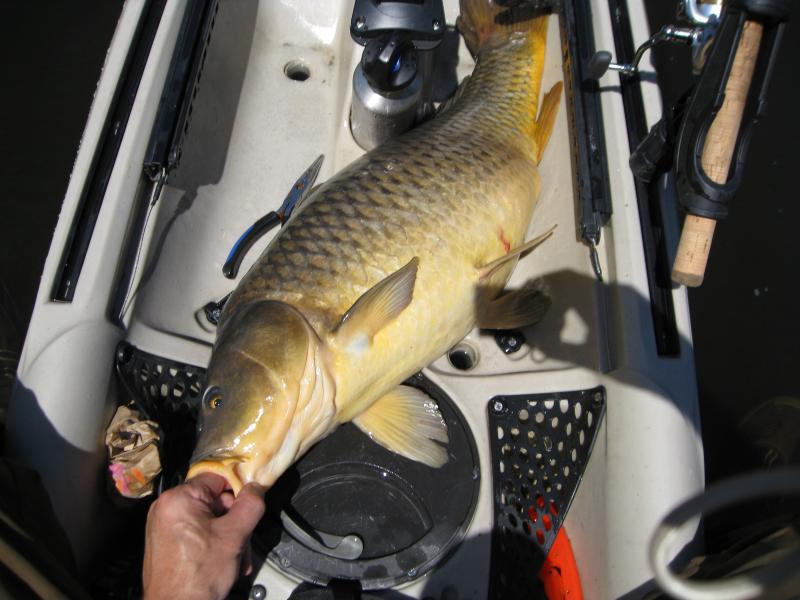 So today I tried to scope out the Dundee area of the Passiac River. I launch and right away I have problems with my GPS/fish finder. I turn it on and off and eventually just off. At one point I go to shore to find out that the factory mounting kit also popped off the bottom of my kayak and this was the 3rd use! Add to that now I have grease all over the inside of my kayak. I don't like to bash companies for crap over priced garbage so I won't mention their name but it rhymes with hummingbird. So I paddle around and see nothing but carp, no pike, no smallies, just carp everywhere. I decide to pack up and re launch in Fair Lawn and paddle upstream. I pass the Fair Lawn ave bridge, pushing pretty hard to get past the little bit of current directly under the bridge. I start fishing the relative still area 50-75 yards from the bridge and WHAM! my heavy rod bends into a U and it's time for a Nantucket Sleigh ride. After a few pull I realize this thing isn't coming up and I better start one arm paddling my way out of the trees. The fight continues for 7-10 minutes and eventually my kayak and the fish got pulled by the current to the down stream side of the bridge where I finally was able to land (snagged by spinner above mouth), after another 5 minutes, the biggest carp I have ever seen in person (Released on his own power). Just goes to show no matter how bad the day of fishing is, just one fish can turn it all around. I was so tired I decided to pack up and head home. Thanks for letter me share.