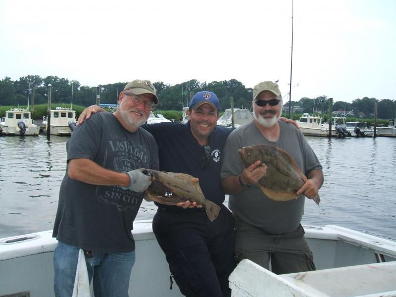 inspite of the weather forecast for this afternoon we left the dock at around noon time with anglers barry,dustin and fred, we headed to the reach channel where the water and wind were not a problem and the drifting conditions were good as well. This was a short trip but the anglers were into the fish with a mix of short fluke and keepers, the big fish caught by dustin came in at 25 inches long, also at least 2 other keeper size fluke were lost at boatside. The anglers fished hard they were dragging bait using squid and spearing, a good time was had by all.