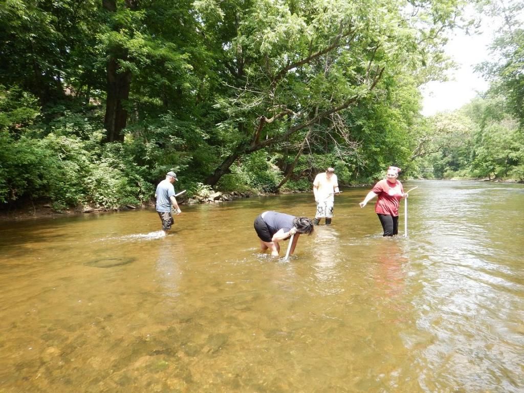 The technique involves taking a rock and figuring out the smallest hole it fits through. Then you yell out the measurement to the recorder. The water was cool and our volunteers are always happy to be up to their knees in the river. What else do you see in this photo on the Musconetcong river ?