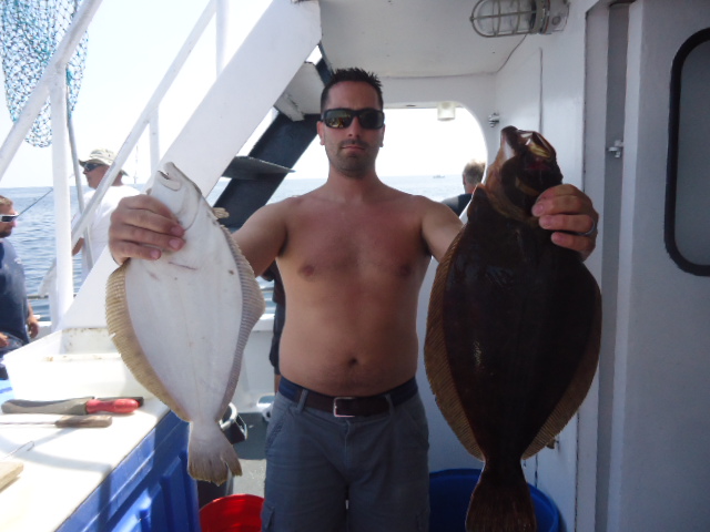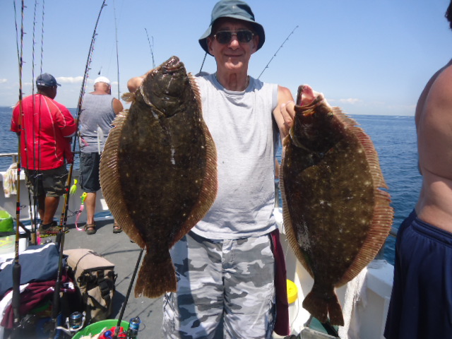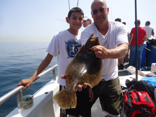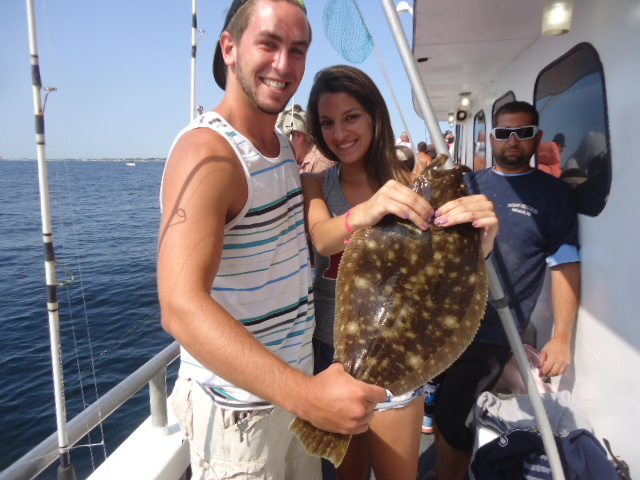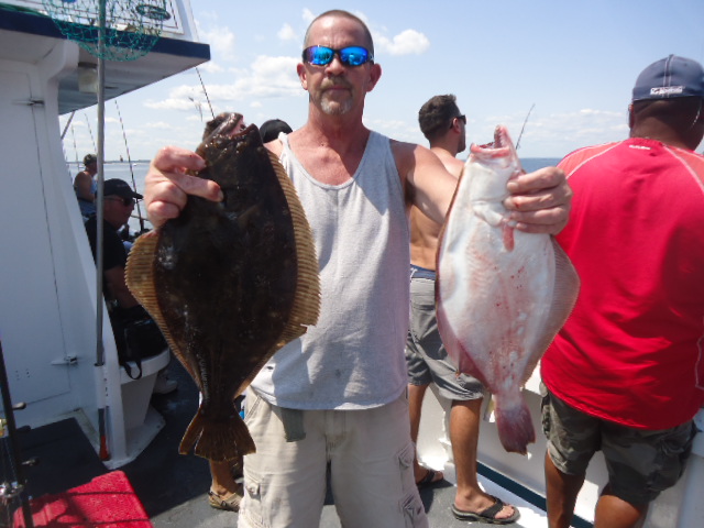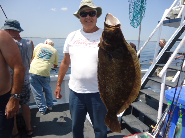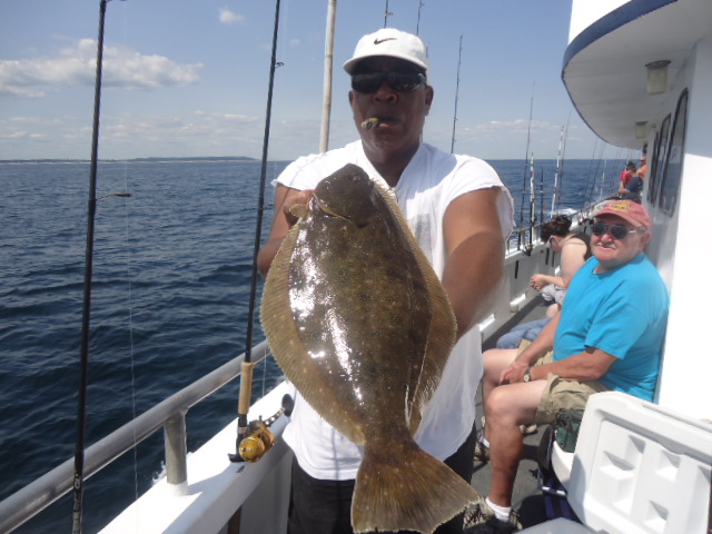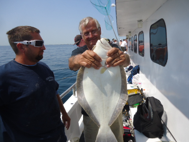 7-30-14 The ocean was pretty much as nice as it gets...Warm,,water temps around 72-73 degrees...Flat calm...no wind and crystal clear water..We actually had mahi-mahi swimming around the boat,,,a couple of small mako sharks also came by to check us out...We started out in areas that we have been doing good this morning but the life was very dull..Only a few keepers and a few shorts the first couple of drifts....Eventually we got into an area that held some nice fluke and we started picking at some nice fish. Linden had the biggest of the day that went 9lbs and took the five dollar pool....Ralphy had the next biggest about 5-6lbs.and took the ten...Ralphy also had his limit of all nice fish...Some guys had 2-3 keepers,,,some just one and maybe some sea bass or ling...But it seemed limited to certain guys today,,,,some guys were just hot and some were not for some reason...Like I never see that,,,but anyway it was a nice day and we had some guys do good and we got into some nice fish,,,,,I just wish I could of had more guys do better.Check out some pics....Most of the nice fish were caught jigging,,,but I did see some nice ones on the rental rods again...See ya for coffee tomorrow!!!!!!!!!!!!