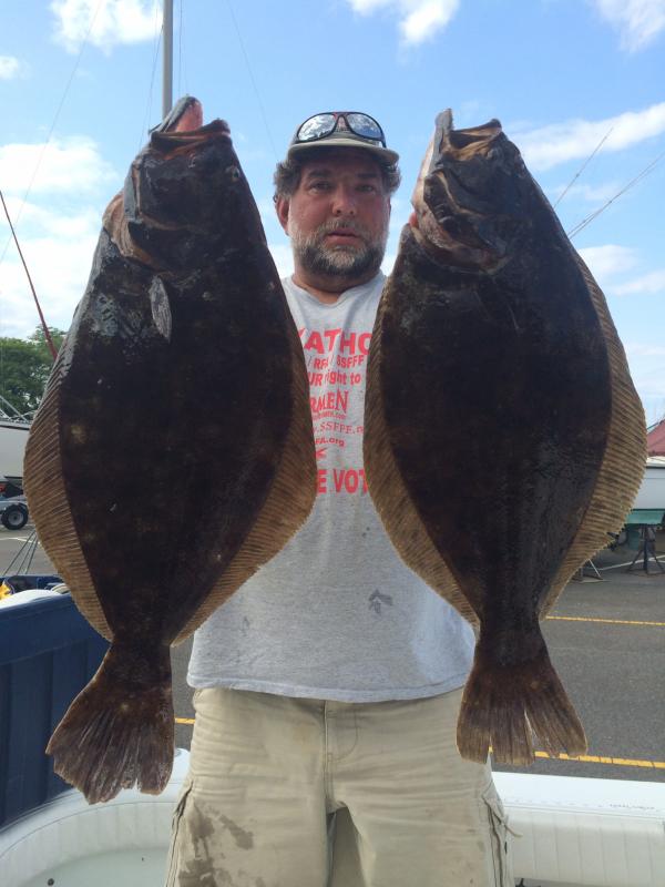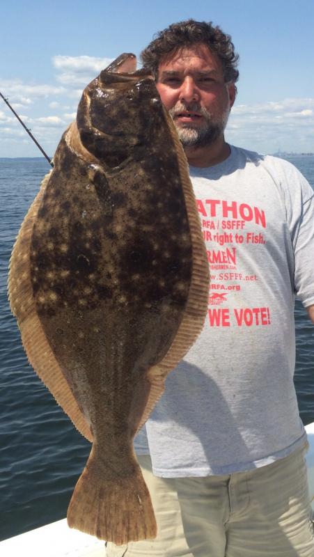 Was joined last minute by cubasfinest and his cousin (or something). Made some calls and decided to go south. Found crystal clear 74* water and tossed the jigs in. It didn't take long for me to get the first keeper at 19 inches. A little while later both Cuba and I hook into simultaneous big fish! His comes up first mine right after. A couple of five pounders! A little while later I get slammed and drop a seven on the deck. This fish was a two tone fluke. Gotta check out the pick up close. Weighed her, kissed her, and let her go as I had enough meat.