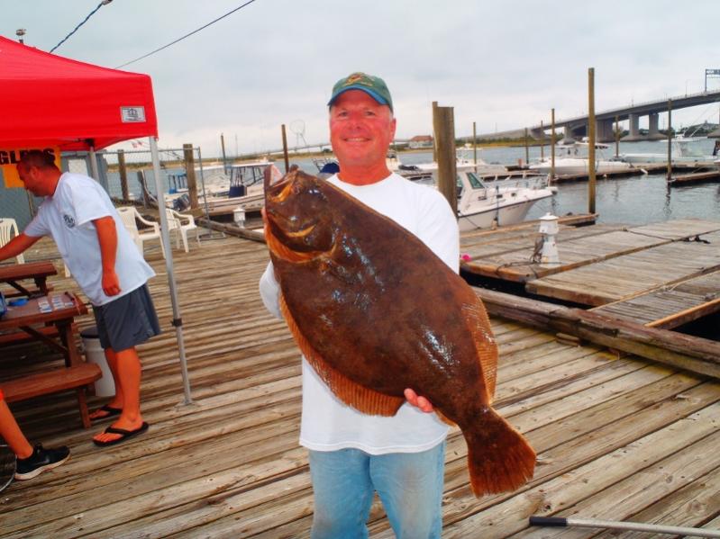|  8/2 Dave's, Door Mat in the Wind, Rain and Snott Today we fishing the Leonardo Fluke Masters and the JCAA Fluke tournaments with Dave and Billy Brink.  We were greeted with steady rain and a honking NE wind, needless to say it was a tad sporty at times. Boys stayed steady at the rail all day, over 80 flatties were caught, the biggest being Dave's 10.6 lb 30" Door Mat, also boated others to 6 lbs. Did not get into the winners circle at the Fluke Masters (5 fish total weight) but we were in 2nd Place in the JCAA Sandy Hook Port. Great job in tough conditions, the Fluke were biting. Congratulations to Dave, Fantastic Fish!!!!!!!!!!! |